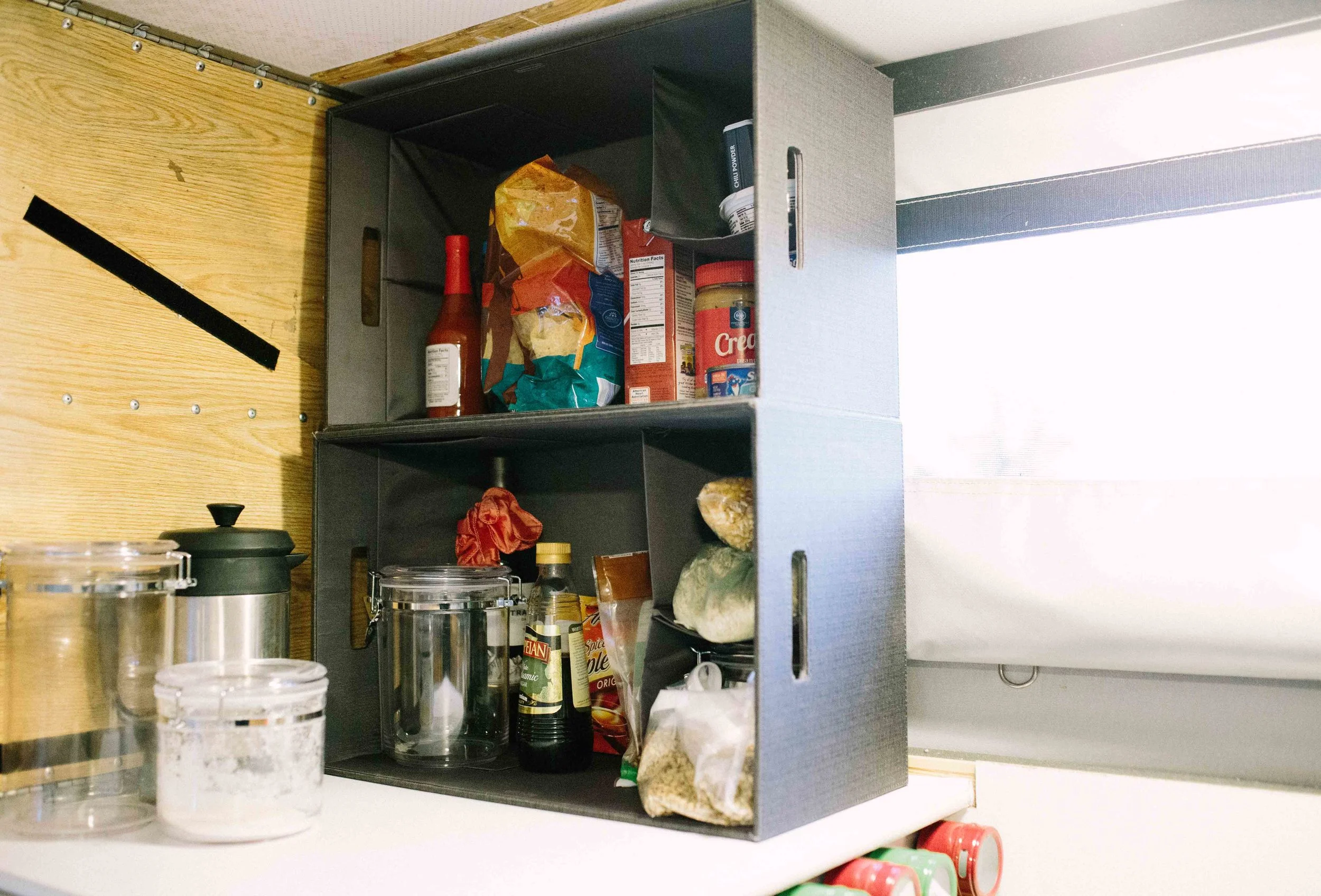 Rubbermaid Bento Boxes will hold our food and can easily be moved to the floor when we put the camper top down
