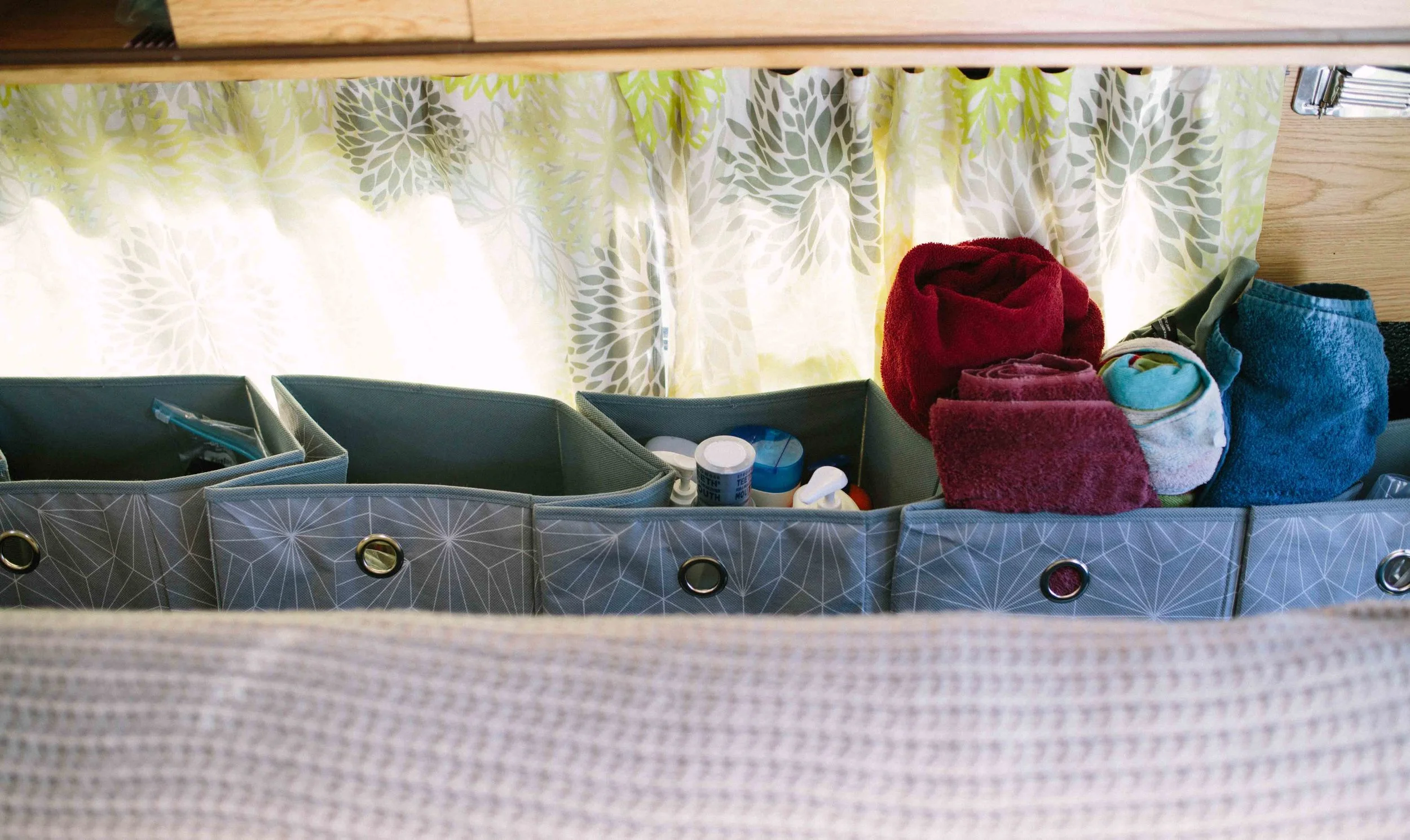 Fabric bins behind our seating will hold towels, toiletries and other random stuff.