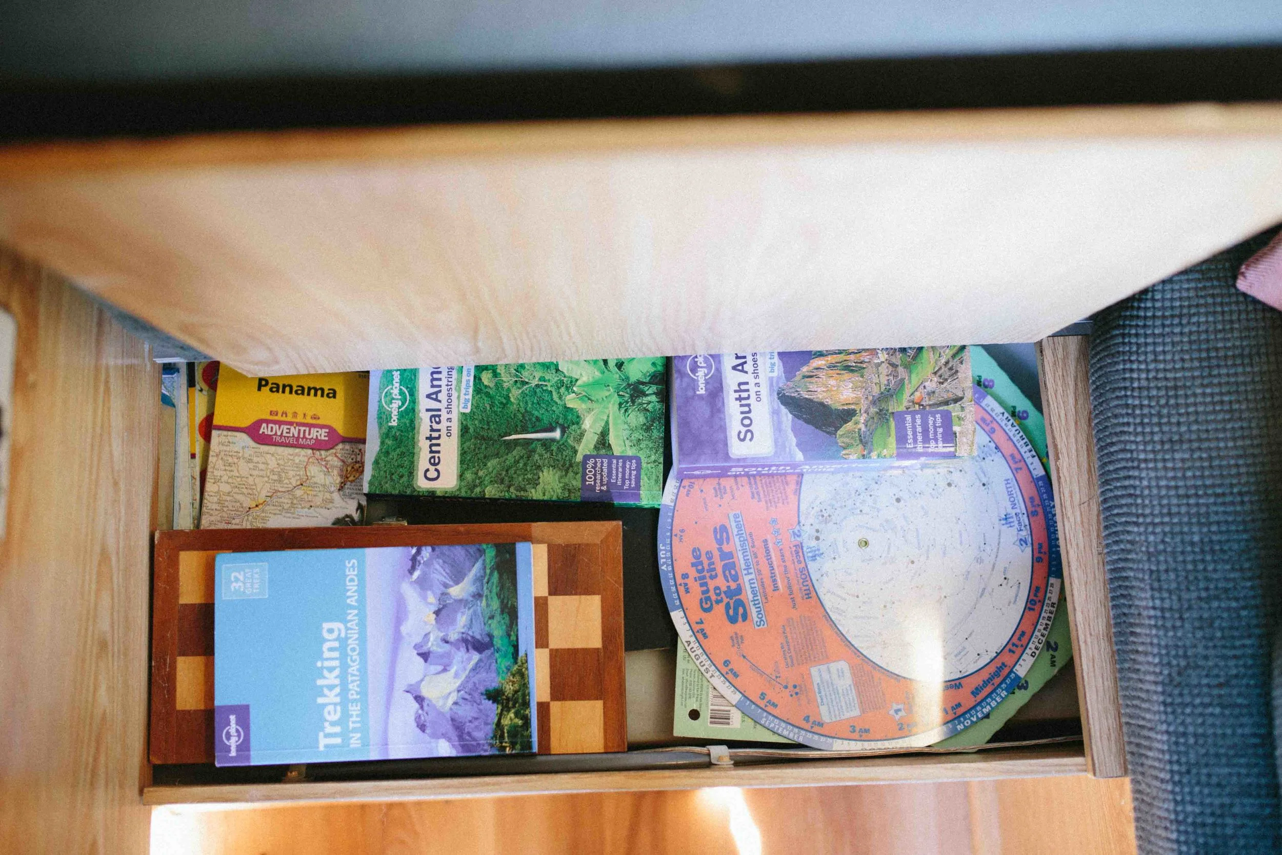 Our interior camper living space including our bed is approximately 6' x 10'. Fitting everything we think we'll need for drastically different climates and geographical regions has been a challenge. We've got scuba and backpacking gear, warm and cold weather clothes and the non-essentials we felt like we couldn't leave behind; our Magic Bullet for grinding coffee and making fruity frozen beverages, tiny umbrellas and straws for said fruity beverages, the board game Lords of Water Deep, a chess set (although I've never played chess, Pete promises to teach me), and a Pétanque set, for all those days on the beach. We'll see what gets left on the roadside in 6 months or so.