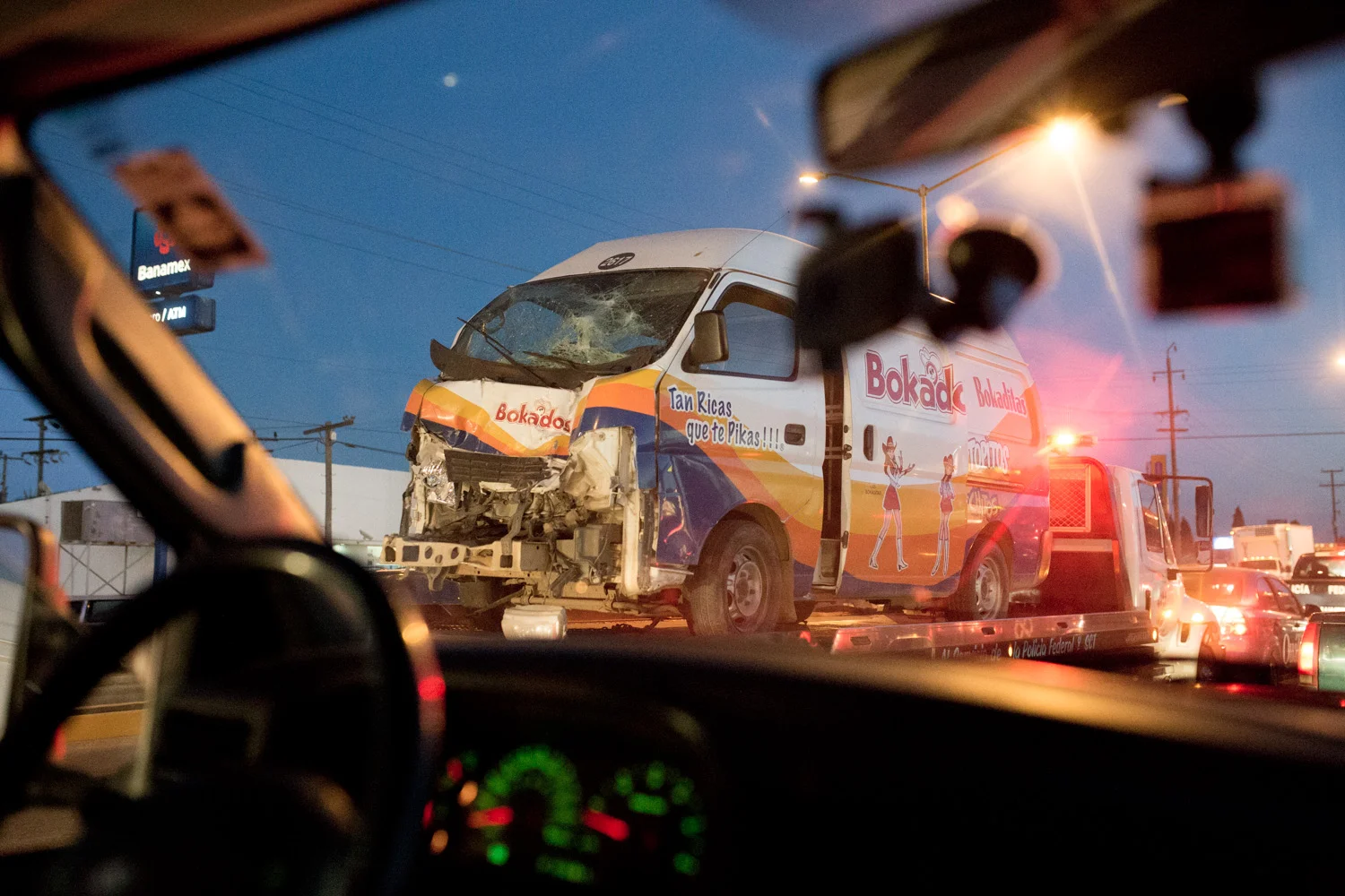 Natasha and I are both freaking out. We really have no idea what to do. We're terrified for the woman stuck in the van, we speak almost no Spanish, have no idea what the procedures for this kind of thing are, and don't even really know what the closest town is. Luckily, an overlander named Benjy stops to see if we need help. He gets on the phone with a friend of his named Rafa who lives here and speaks Spanish. He speaks with the local cop and does some translation for us. He let's me know that the Federales will be taking over the matter and that I should call our insurance company right away. Benjy hangs out for a while longer until a Canadian couple and their son also stop to see if we need help. There names are Dawn, Andrew, and Anthony and they are a godsend. It turns out that they live about ten minutes away and work for a humanitarian relief organization called Live Different. They call a local guy named Felipe who works with them to come down and translate. After what seems like hours of standing around in the cold on the side of the road, we all pack up and drive to the Federale station in San Quintin where the insurance adjusters from our respective companies meet us and everything gets worked out. The other driver is found to be at fault and his insurance will pay for repairs to our truck and camper. He is very nice and apologetic. We find out that his wife is at the hospital but is ok.
